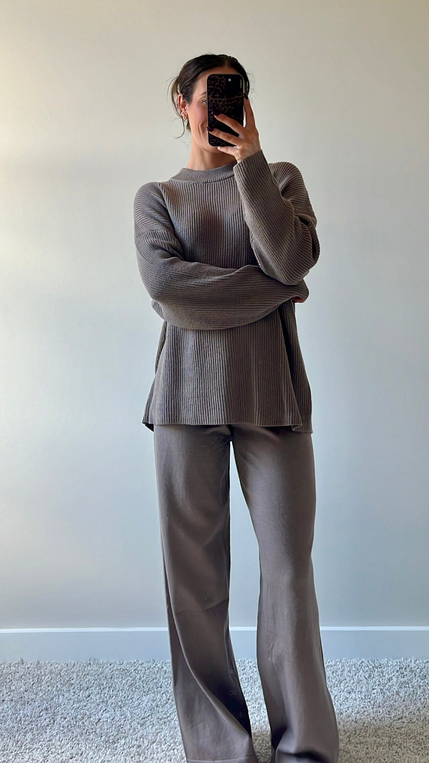 Features: Ribbed knit fabric, Relaxed fit, Crew neckline, Long sleeve with dropped shoulder, Side pockets