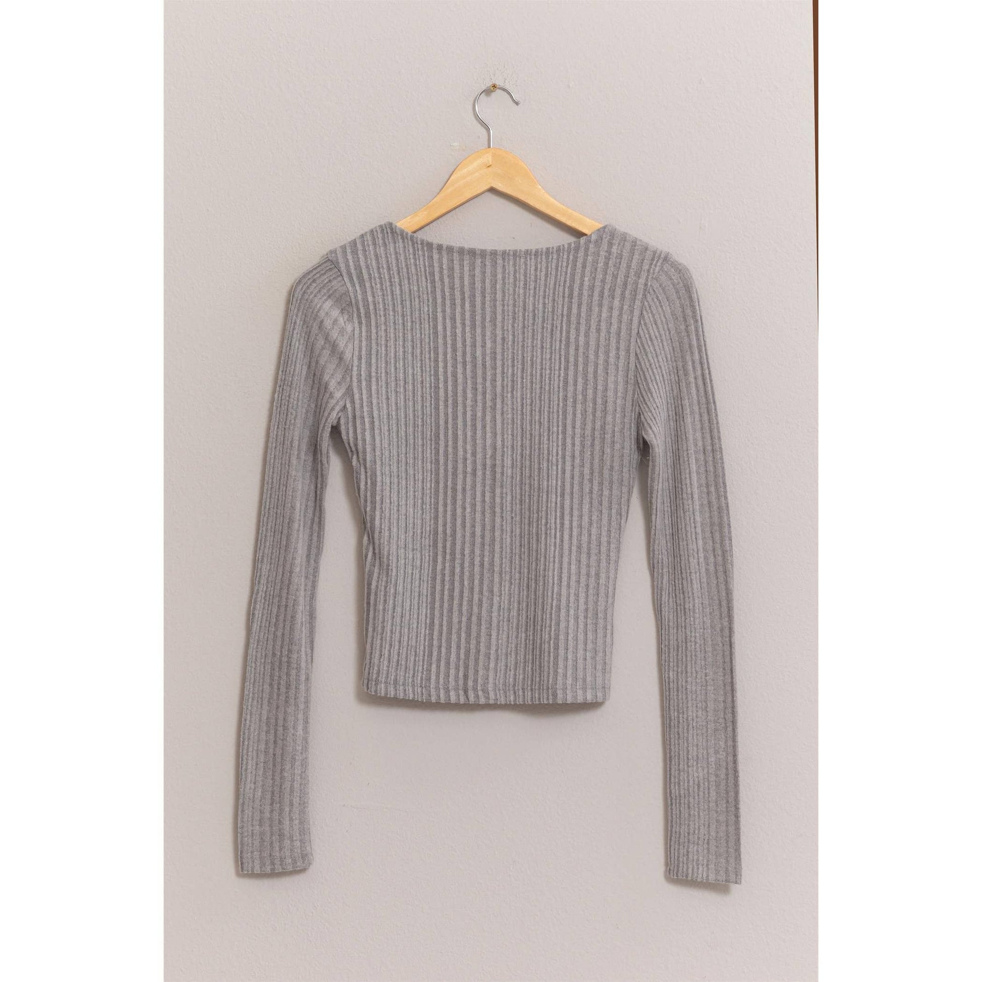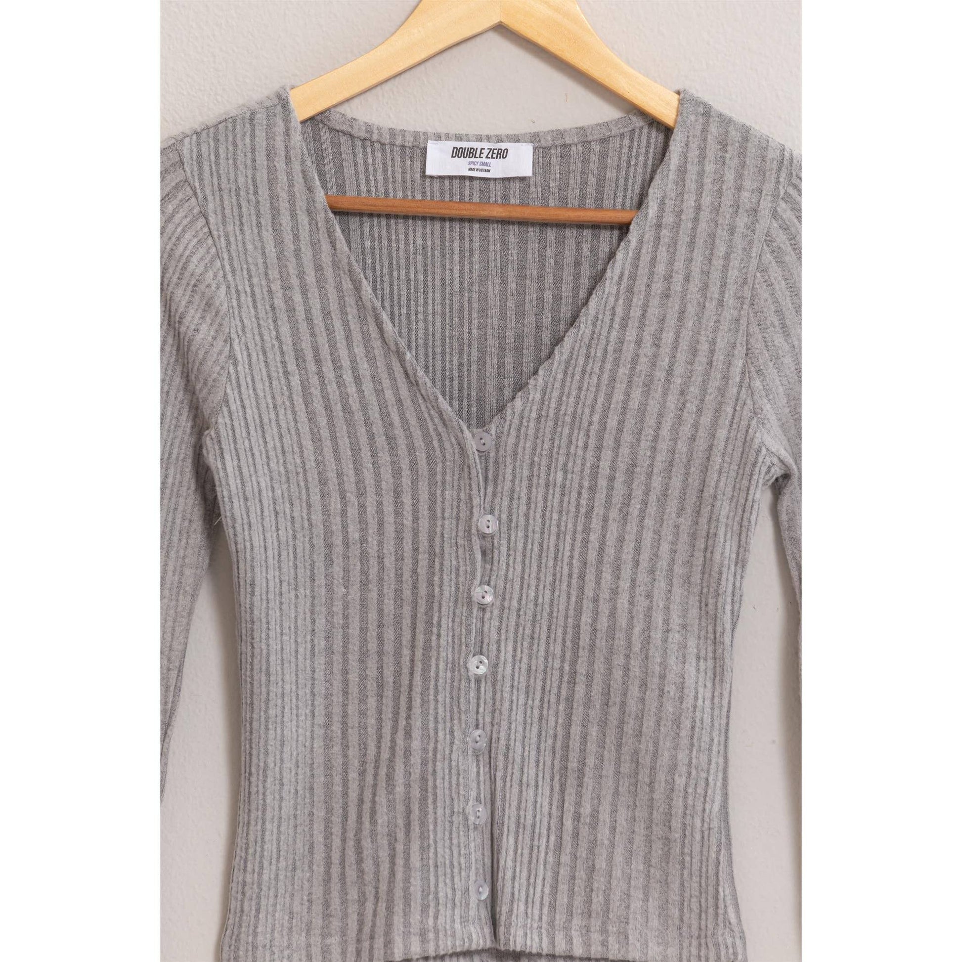 Features: V-Neckline, ribbed long sleeve, front buttons