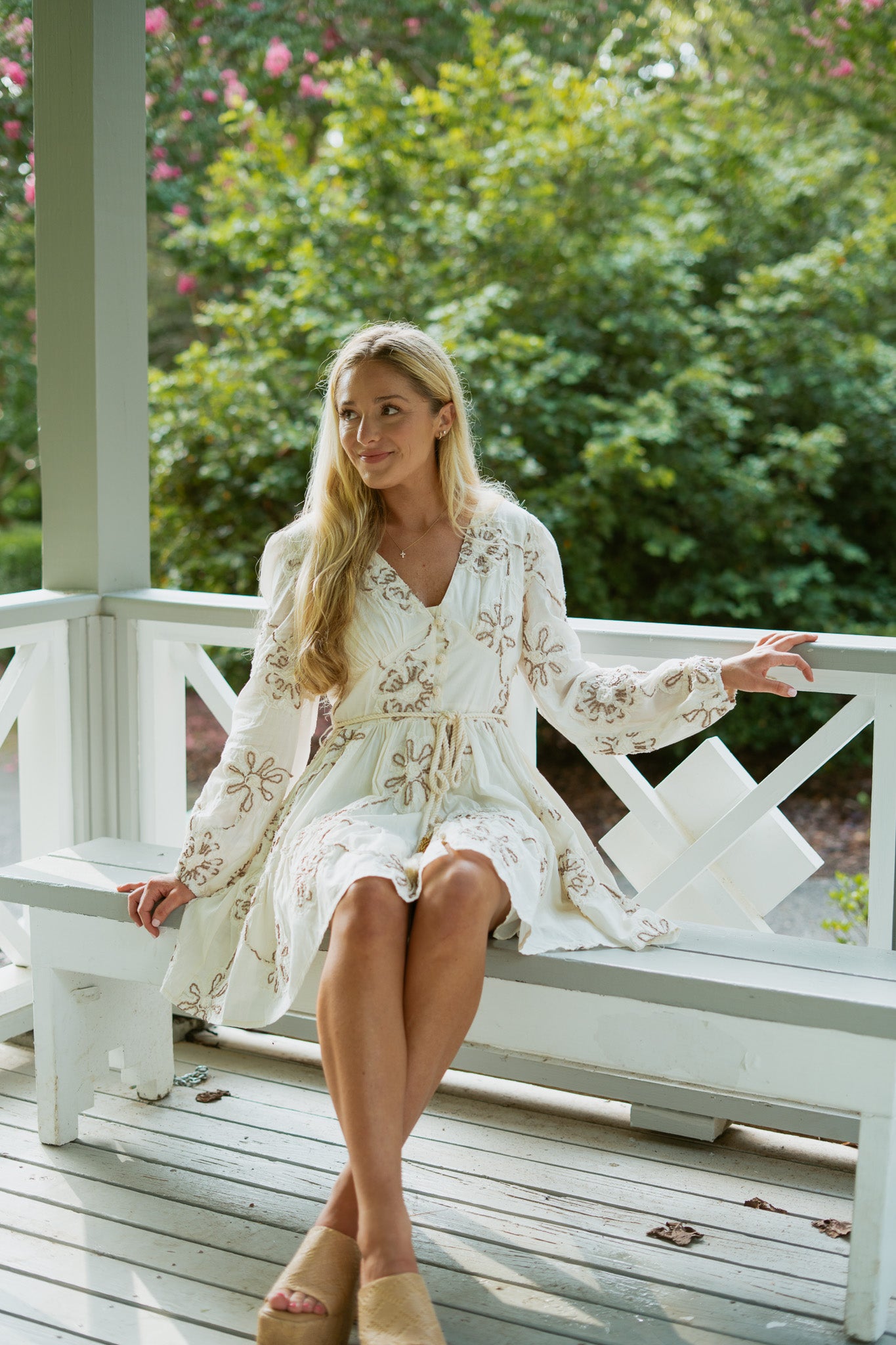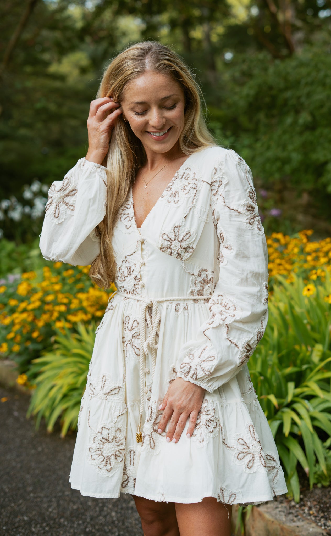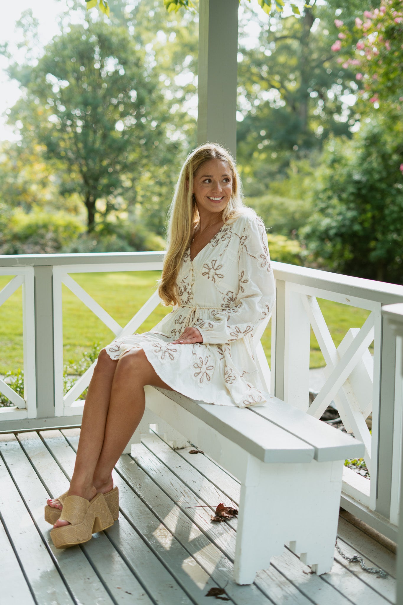 Features: embroidered flora; design, front buttons and waist tie