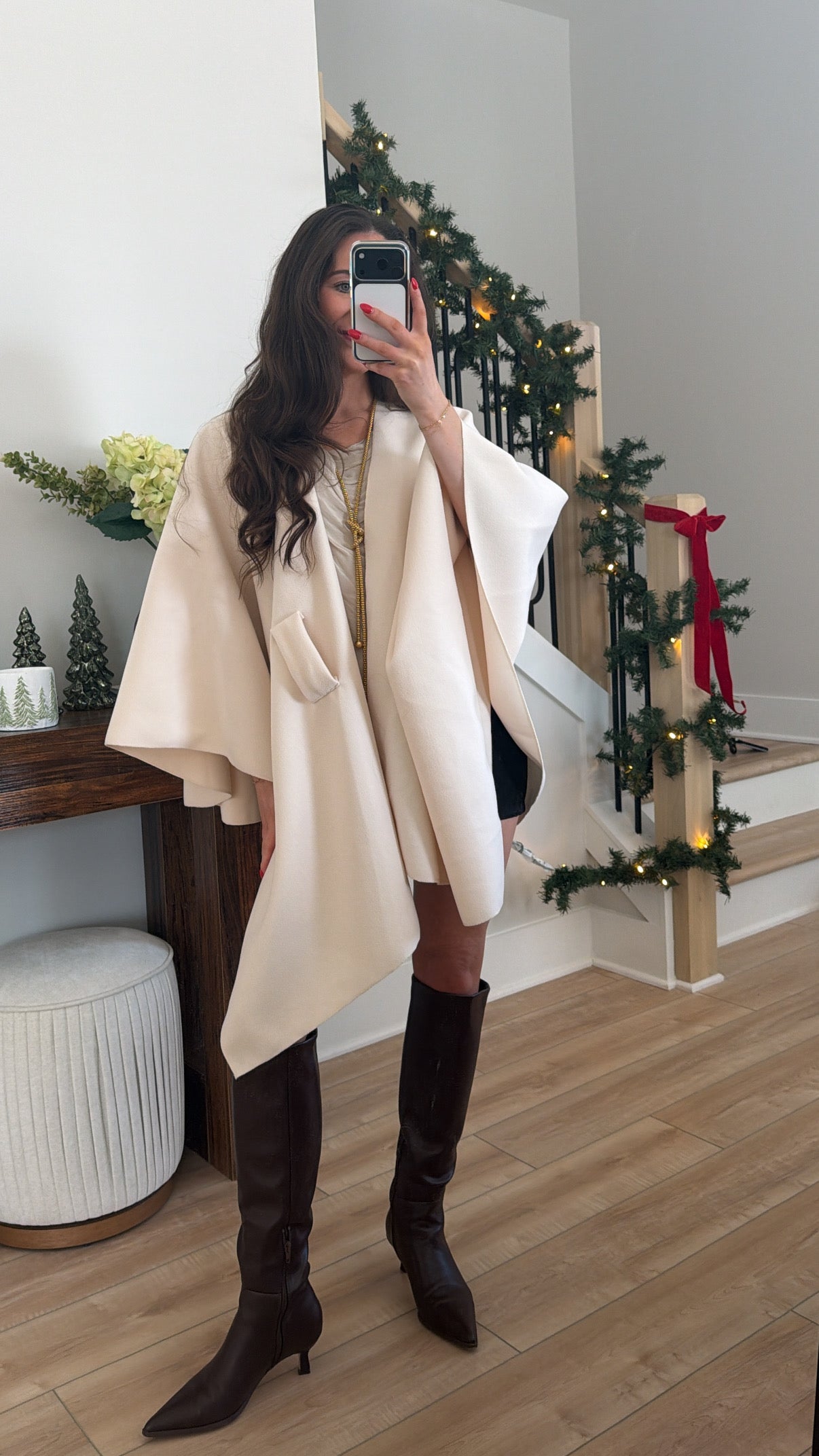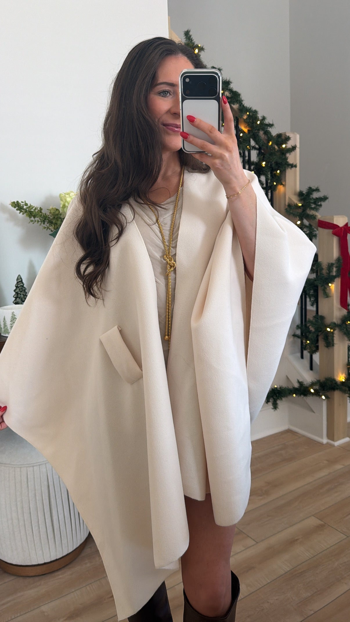 Featuring wide sculptural sleeves, an open-front design, and a clean minimalist finish, it’s the kind of piece that looks straight out of a chic Florence street scene. Dress it up with knee-high boots for a polished evening look or throw it over a simple sweater for an elevated everyday moment.