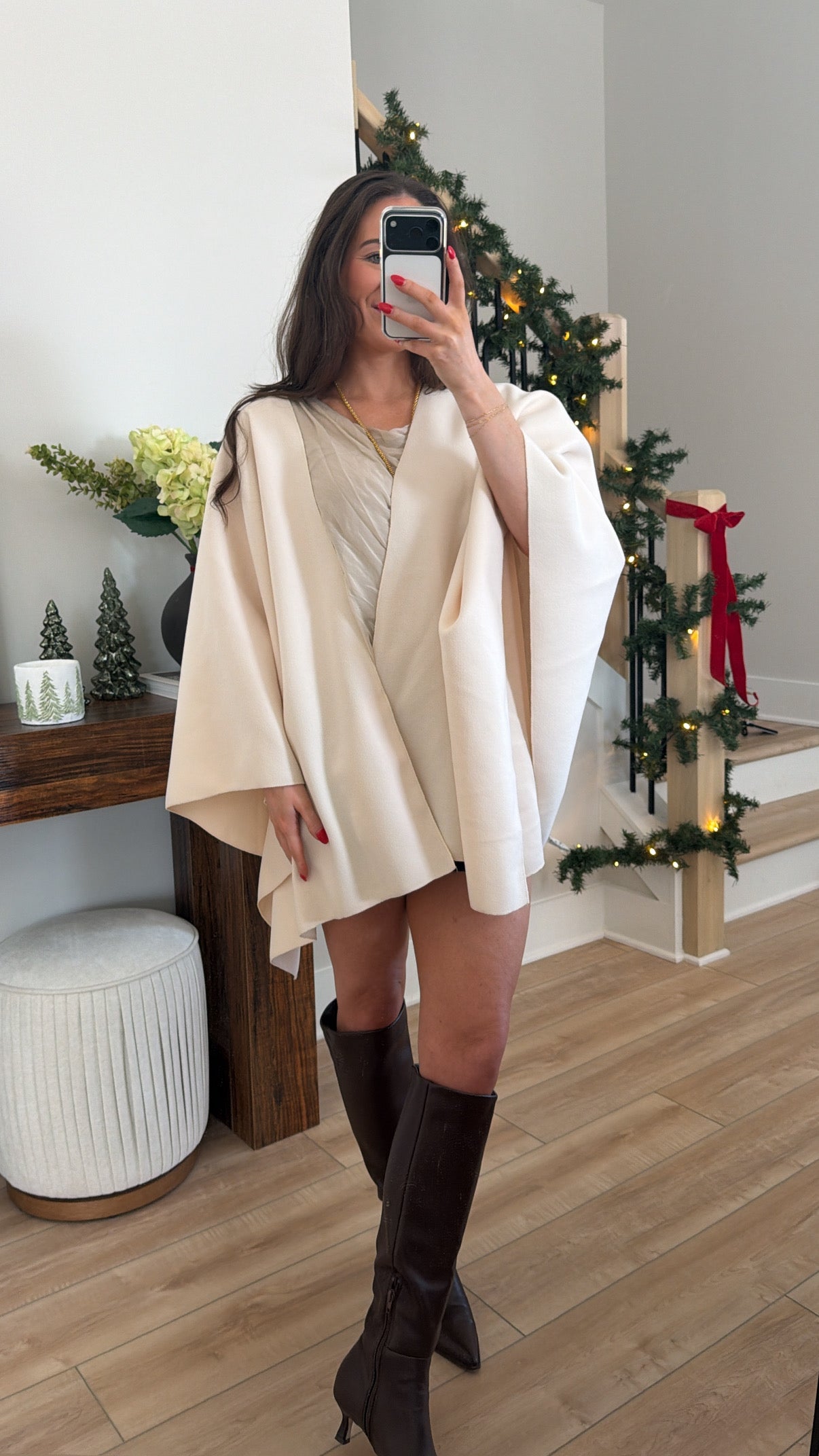 Features: Soft, structured fabric with beautiful drape, cape-style silhouette with wide, flowing sleeves, open-front wrap design, elegant minimalist finish