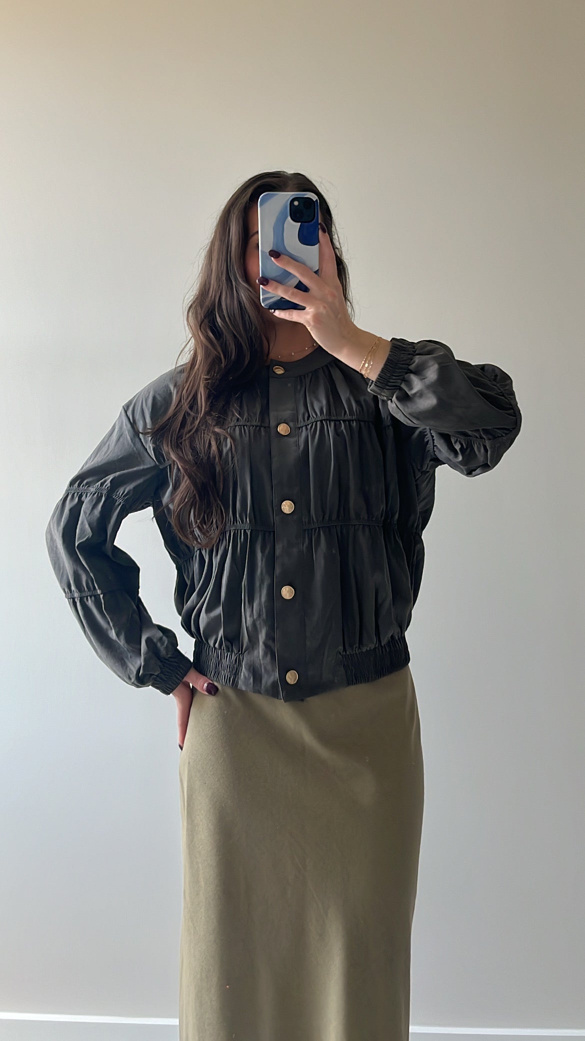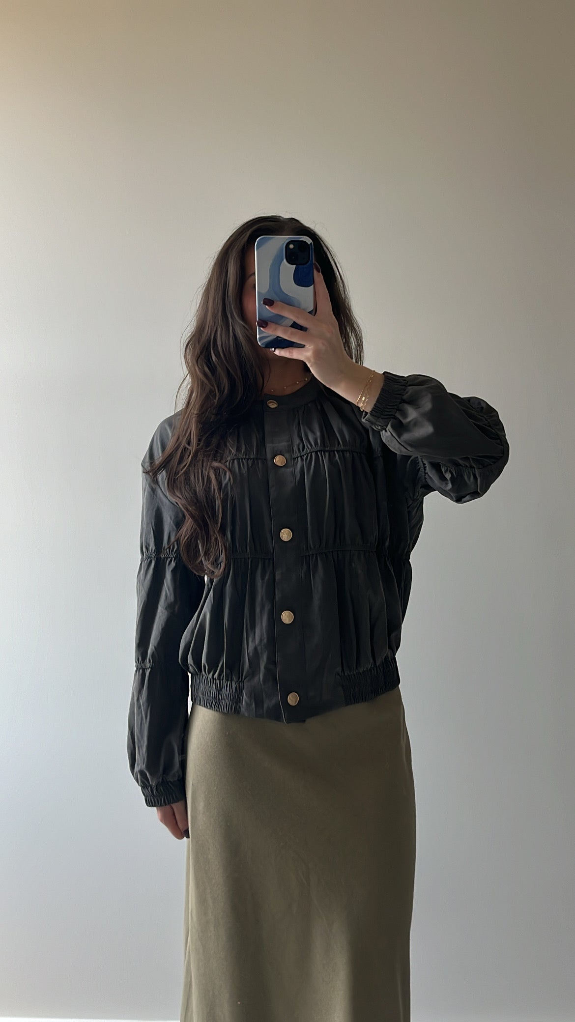 Features: Crew neckline with soft gathered detailing, Elastic hem for a subtle blouson silhouette, Long sleeves with lightly ruched panels