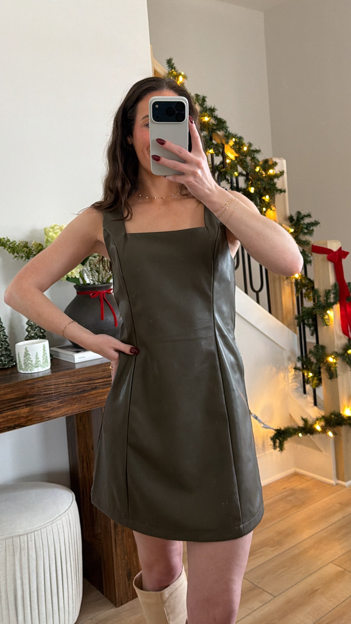 Effortlessly chic with a modern edge, the Mont Blanc Leather Dress is your go-to piece for stylish city escapes. Designed in a smooth, structured faux-leather fabrication, this dress features a flattering square neckline and clean, tailored lines that create a sleek silhouette. The rich olive hue brings a refined, winter-to-spring versatility—perfect for European dinners, rooftop cocktails, or holiday nights out.