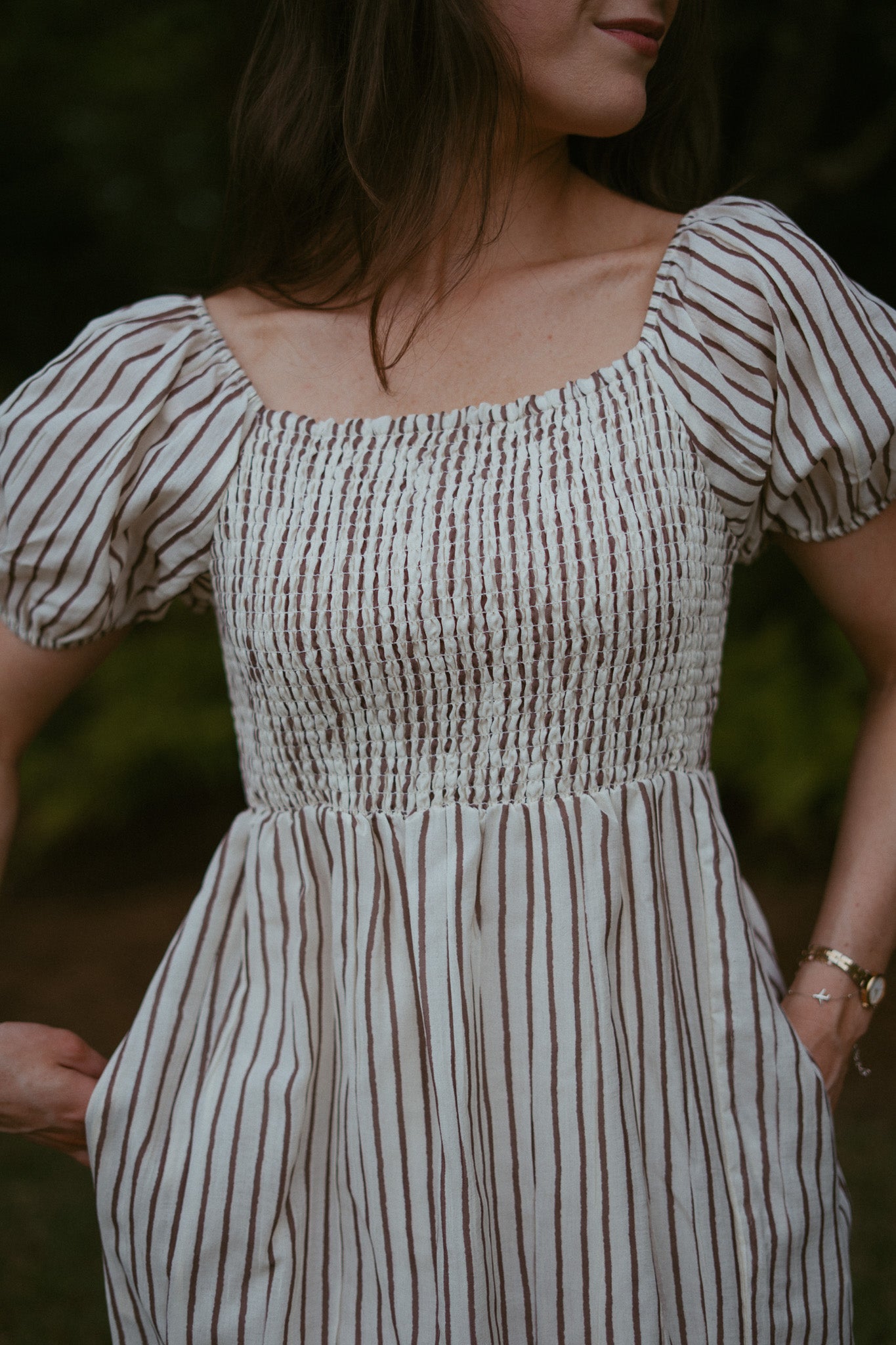 Features: smocked chest detail, side slit, double lined, side pockets