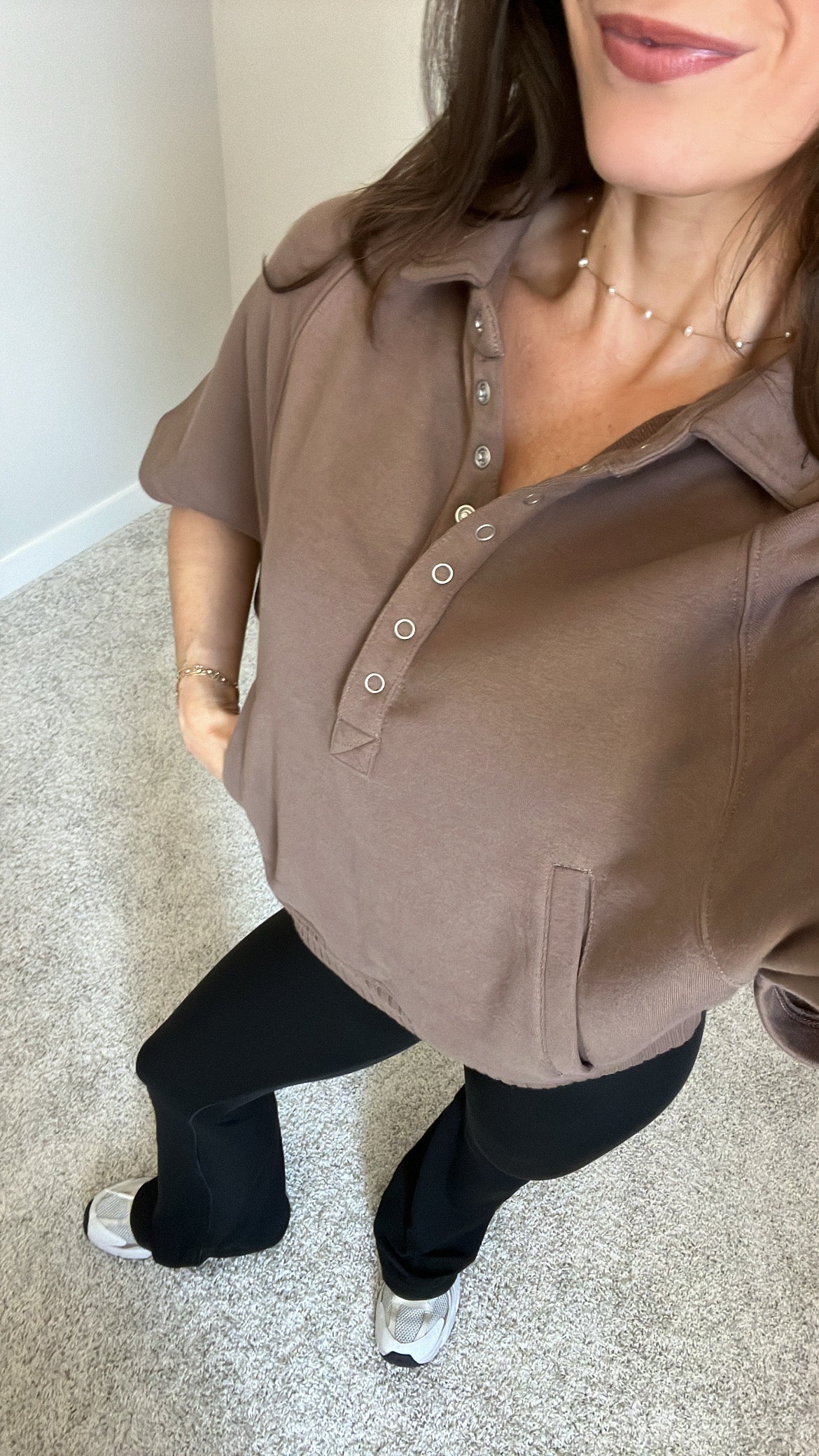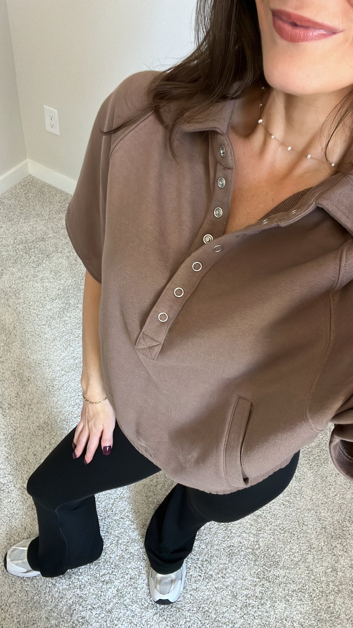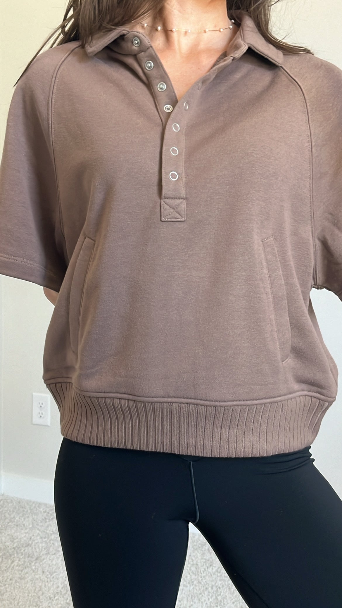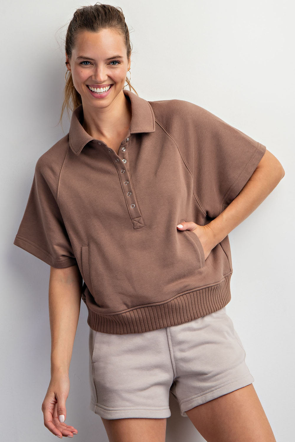 Features: French Terry Fabric, Collared Henley Short Sleeve Top, Button-Up Closure, Side Pockets, Ribbed Waist, Relaxed Loose Fit