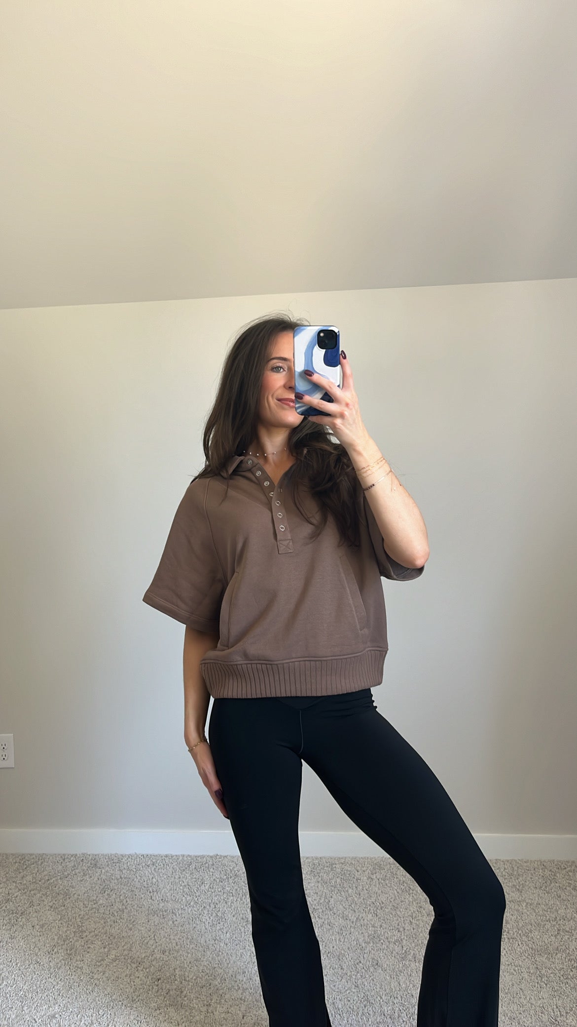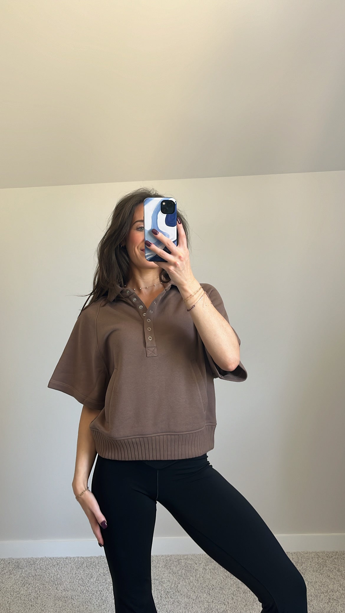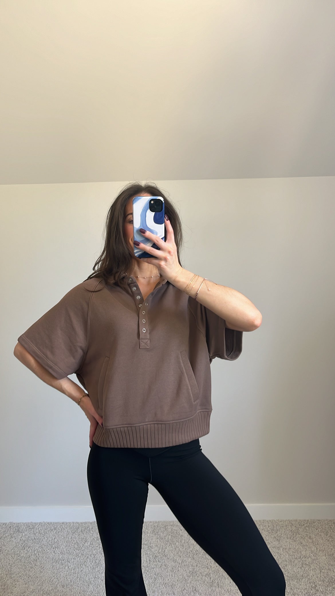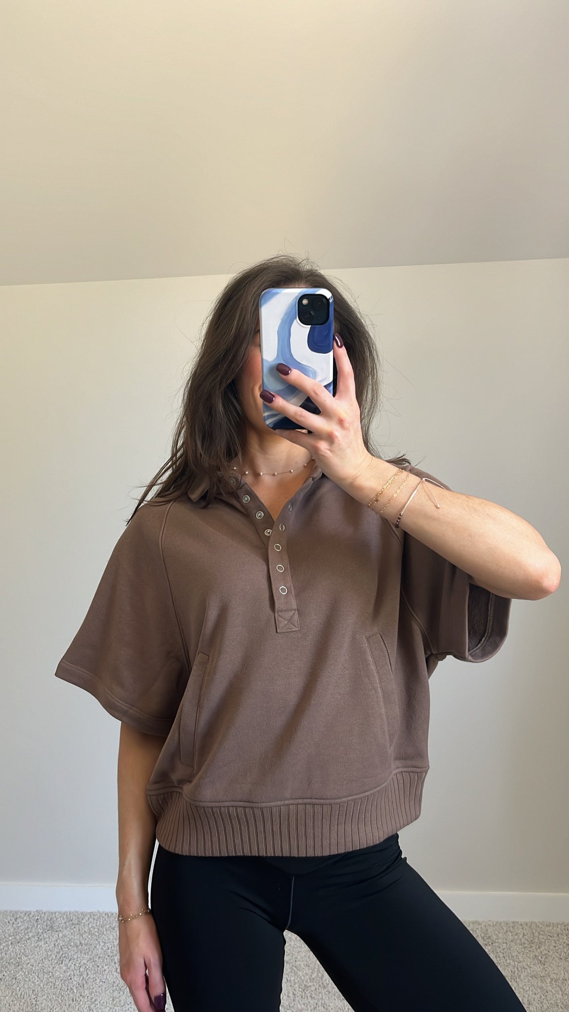 Features: French Terry Fabric, Collared Henley Short Sleeve Top, Button-Up Closure, Side Pockets, Ribbed Waist, Relaxed Loose Fit