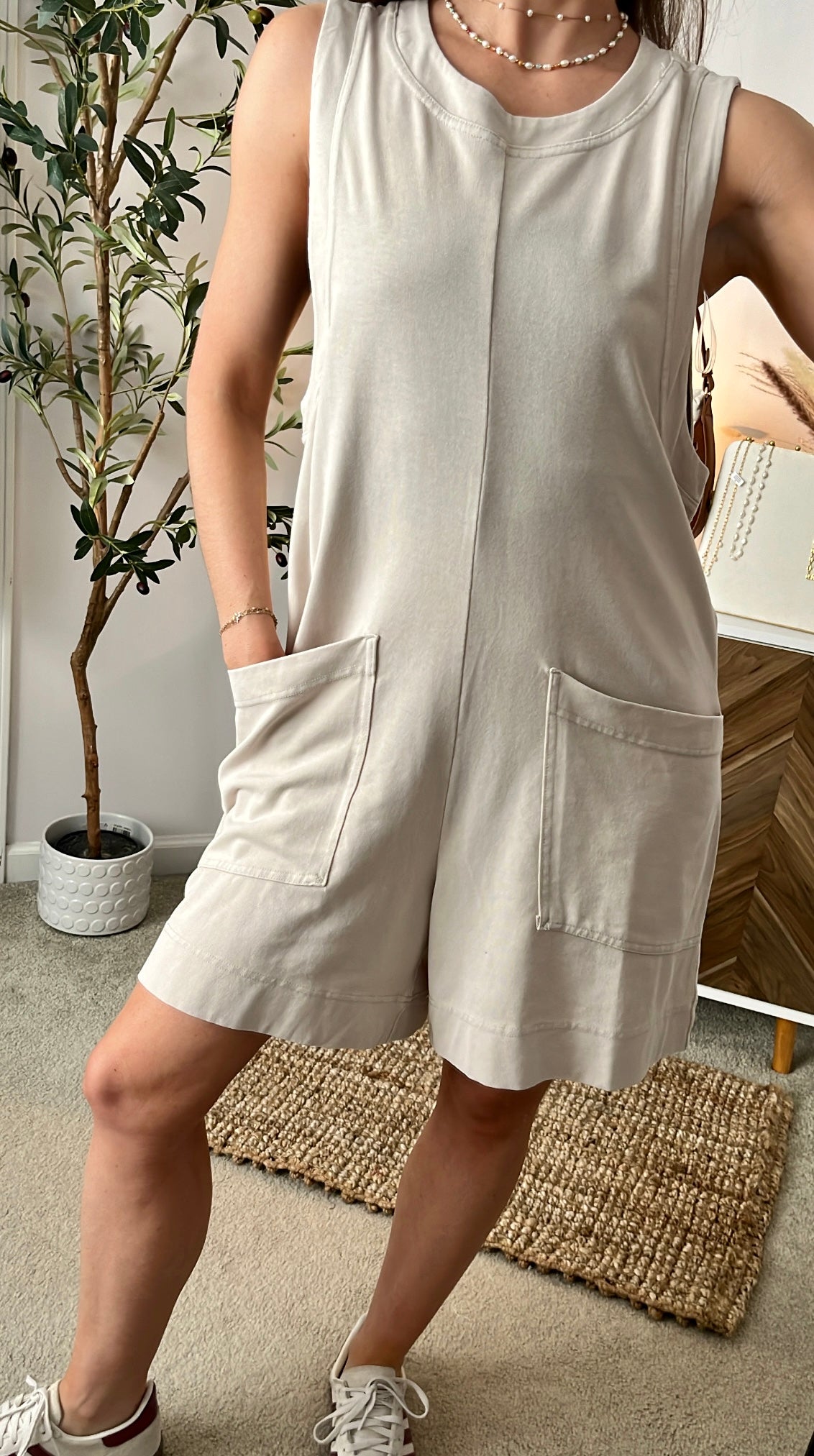 Features: Cotton fabric, Mineral washed, Relaxed fit, Sleeveless, Dropped armholes, Wide cut leg, Open back details, Front pockets