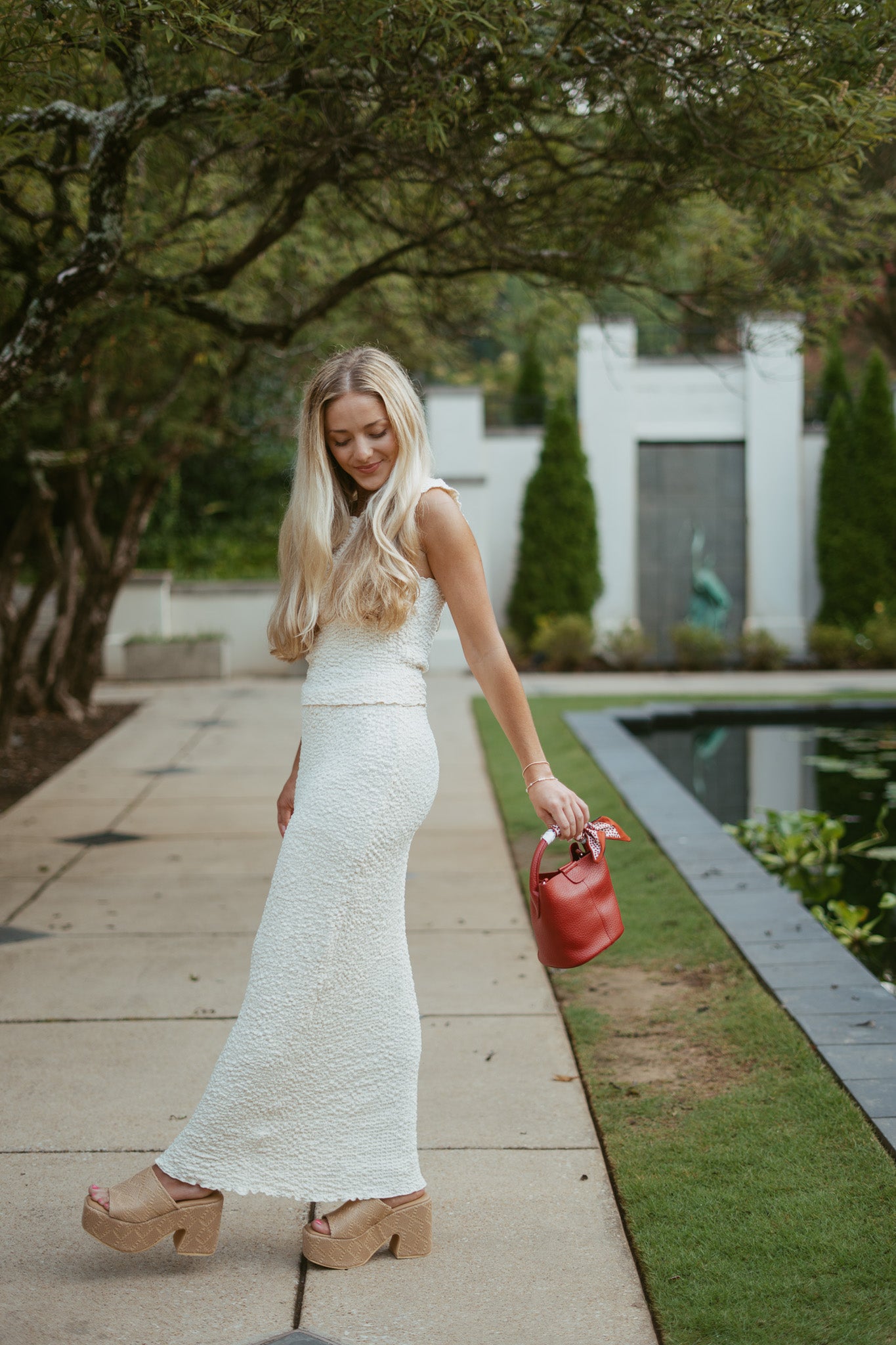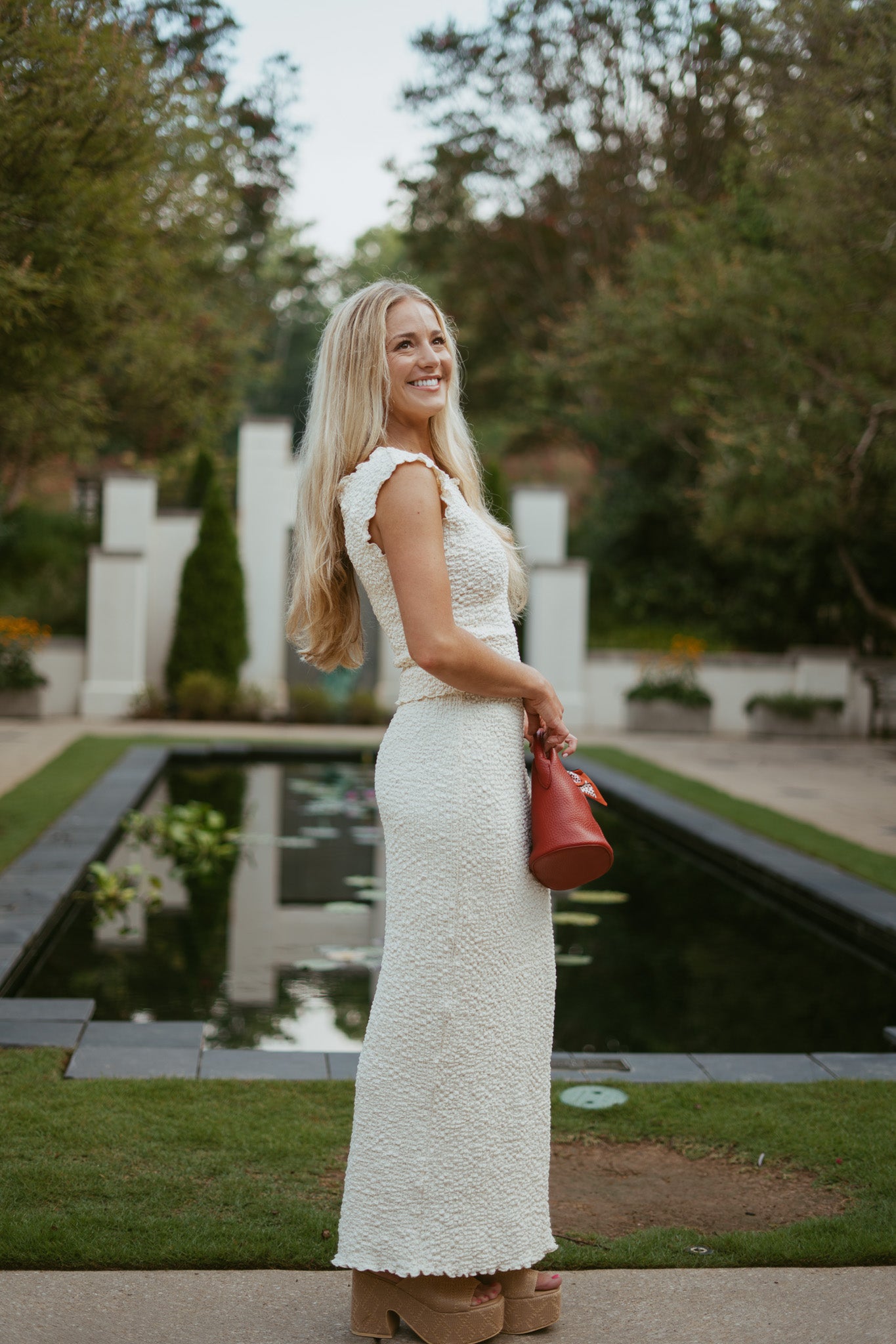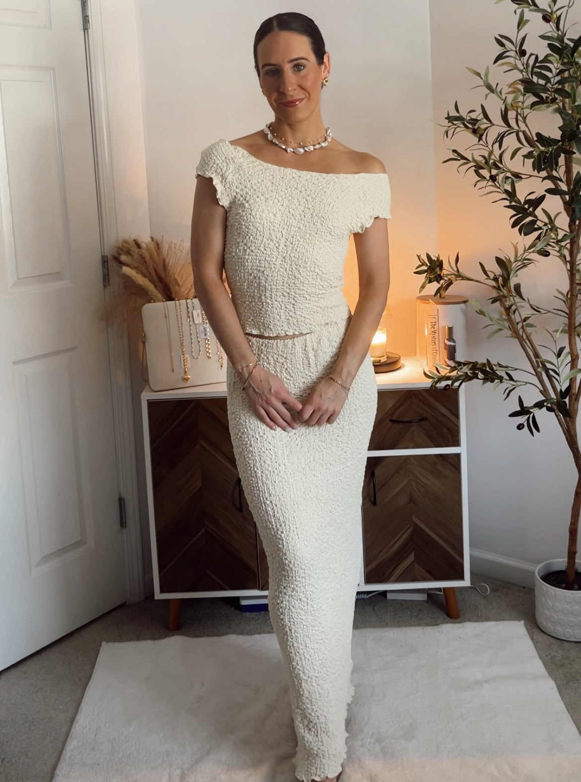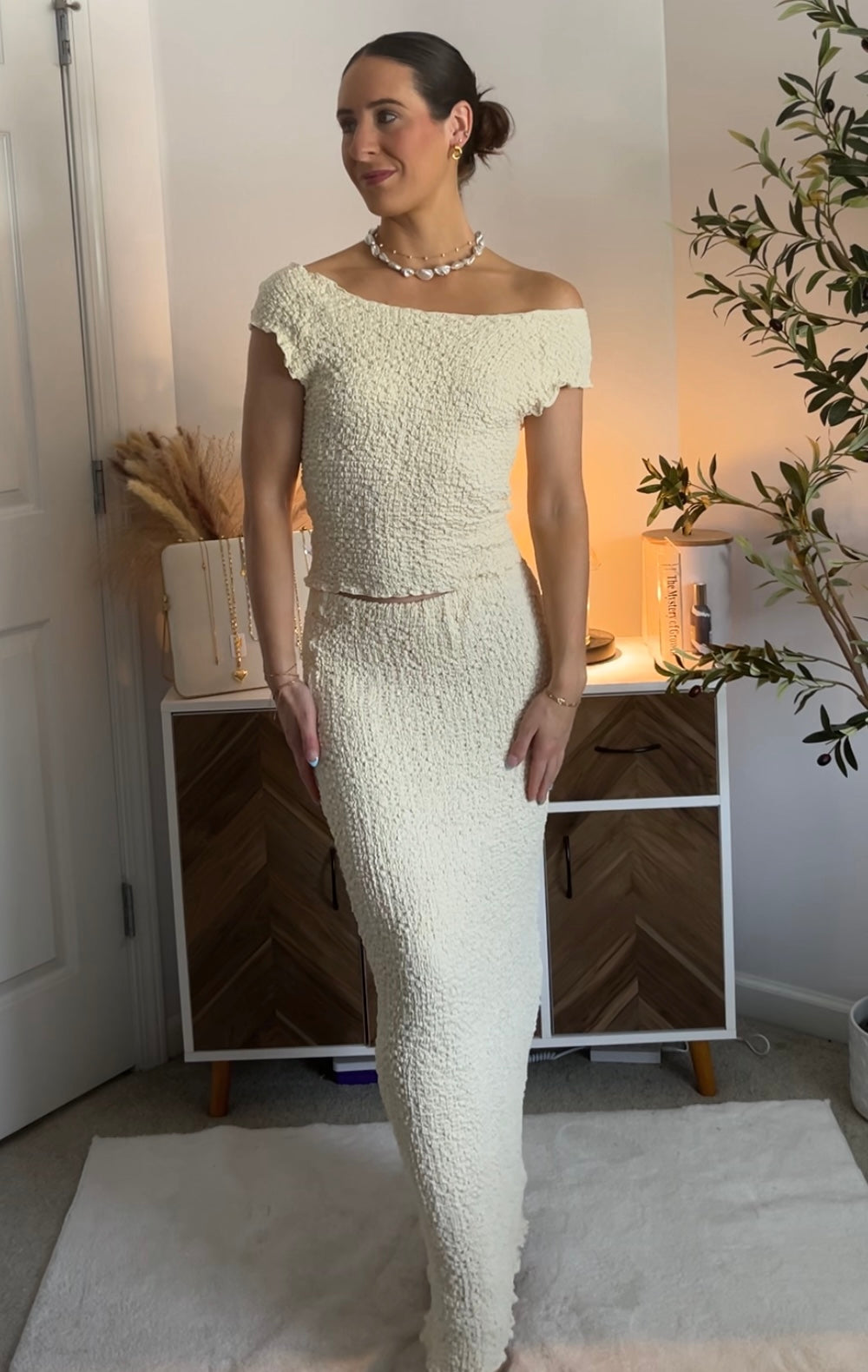 Features: textured popcorn material, boatneck neckline top, can be worn on/off shoulders, semi-cropped length, elastic waistband midi skirt
