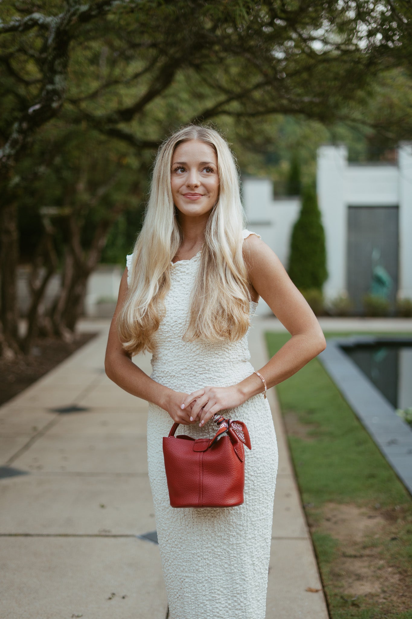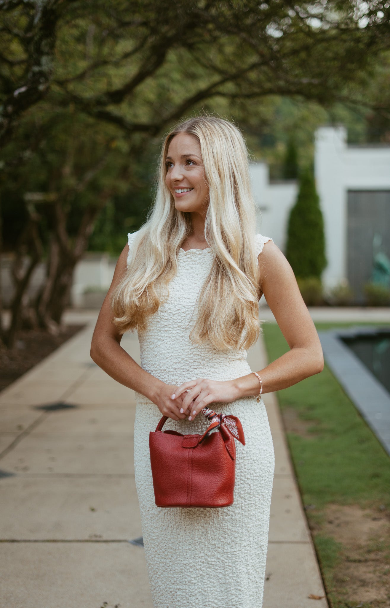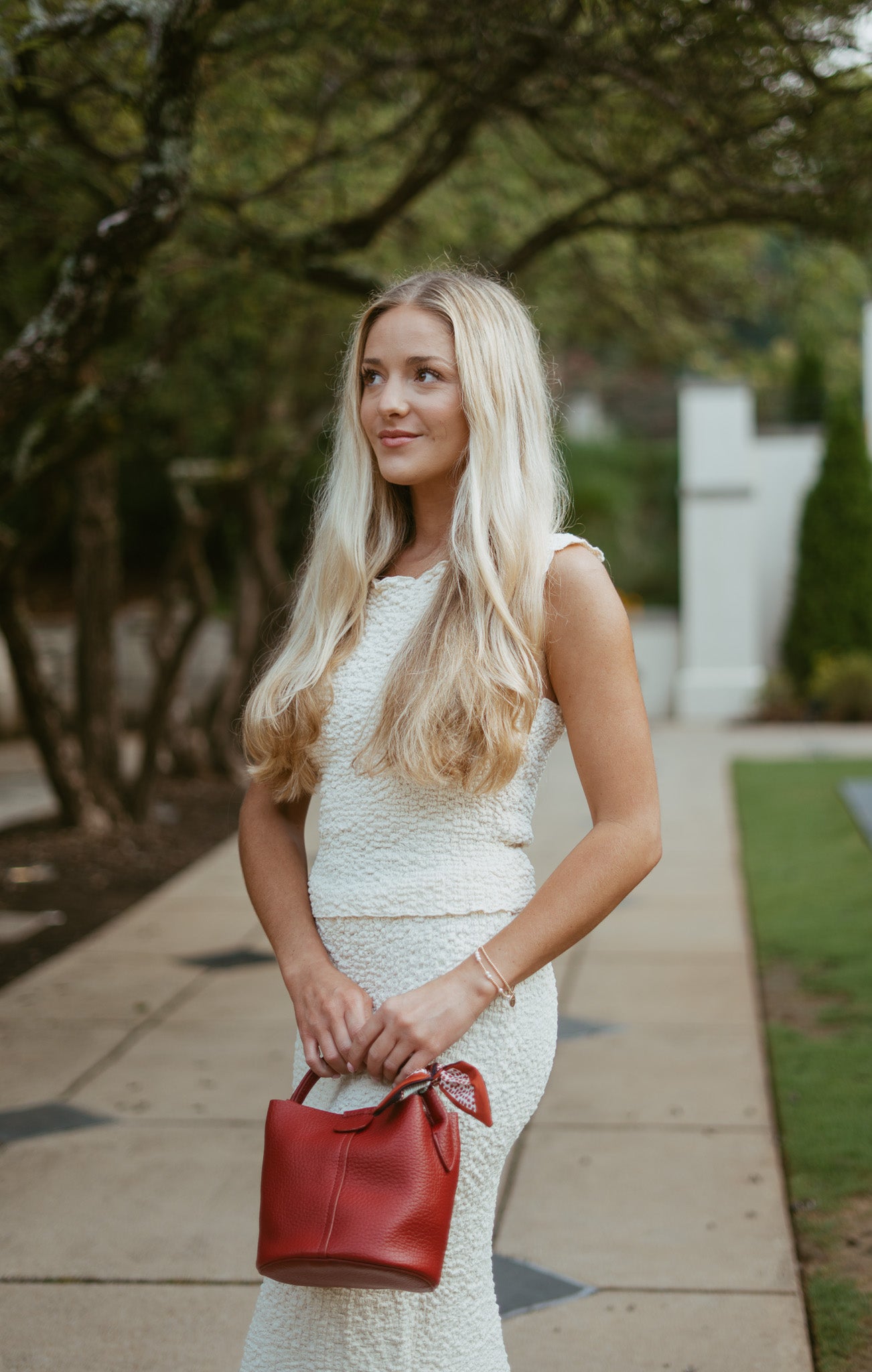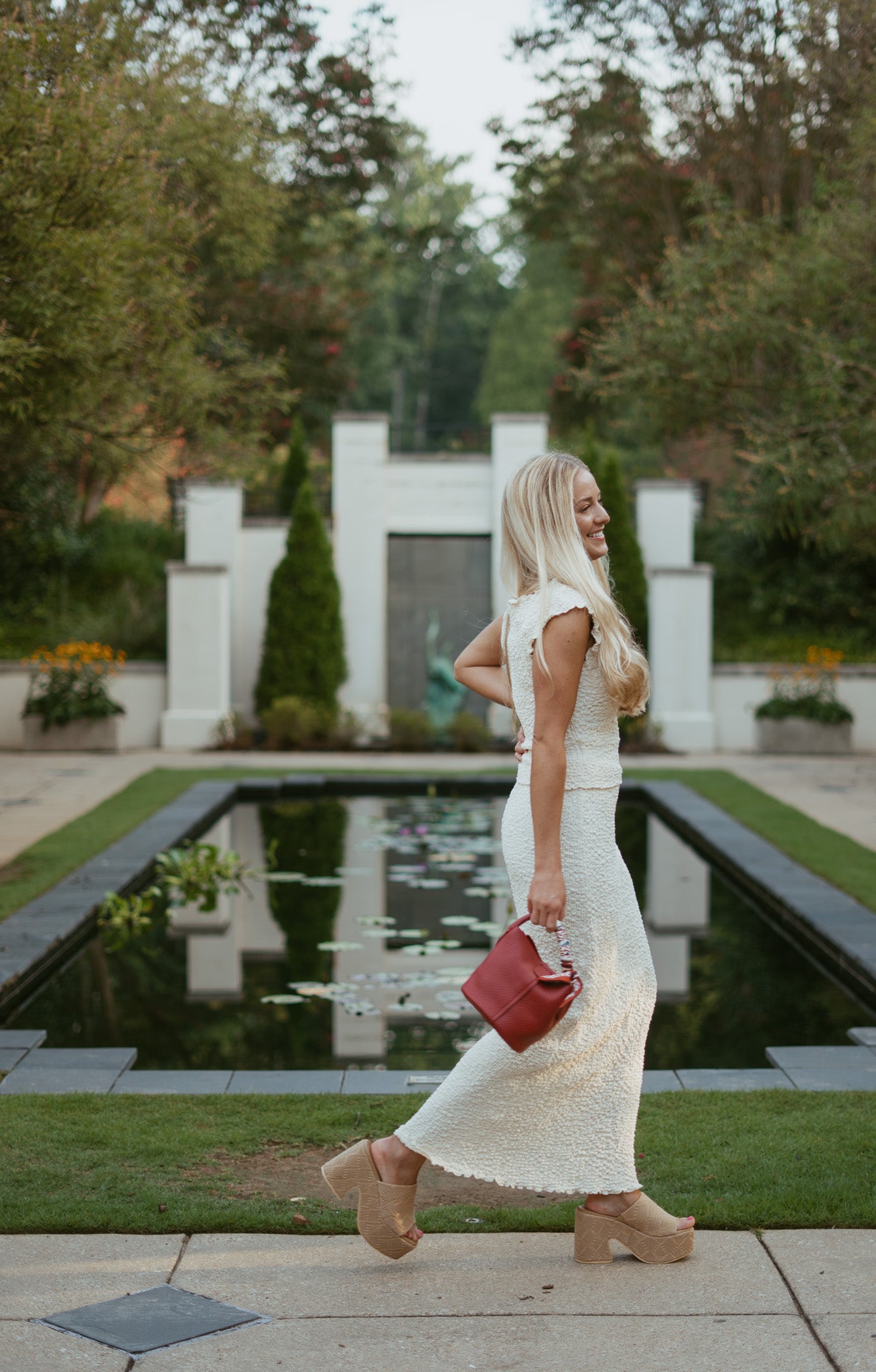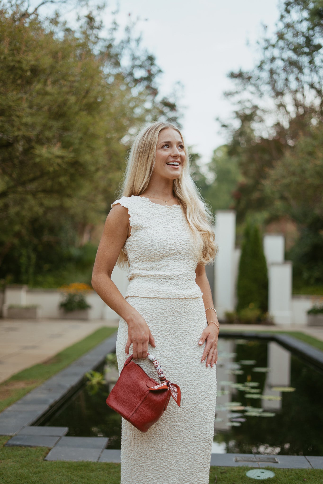 Features: textured popcorn material, boatneck neckline top, can be worn on/off shoulders, semi-cropped length, elastic waistband midi skirt