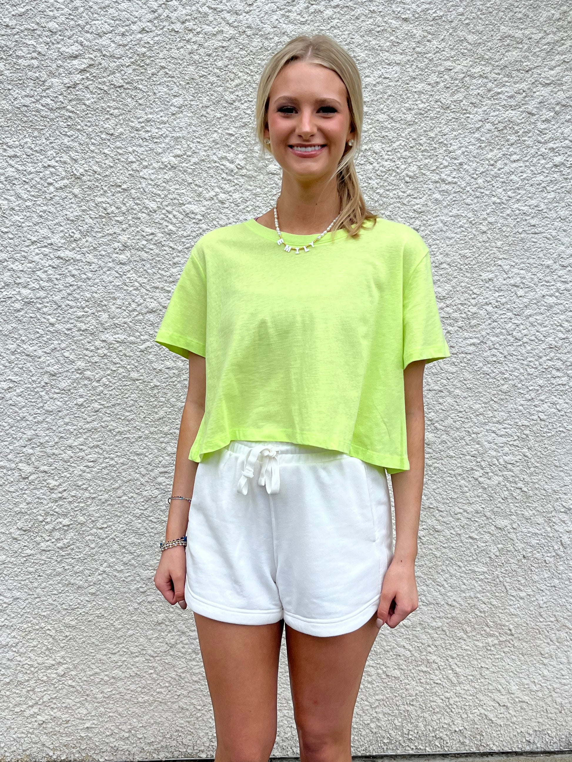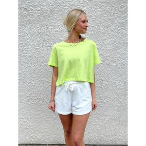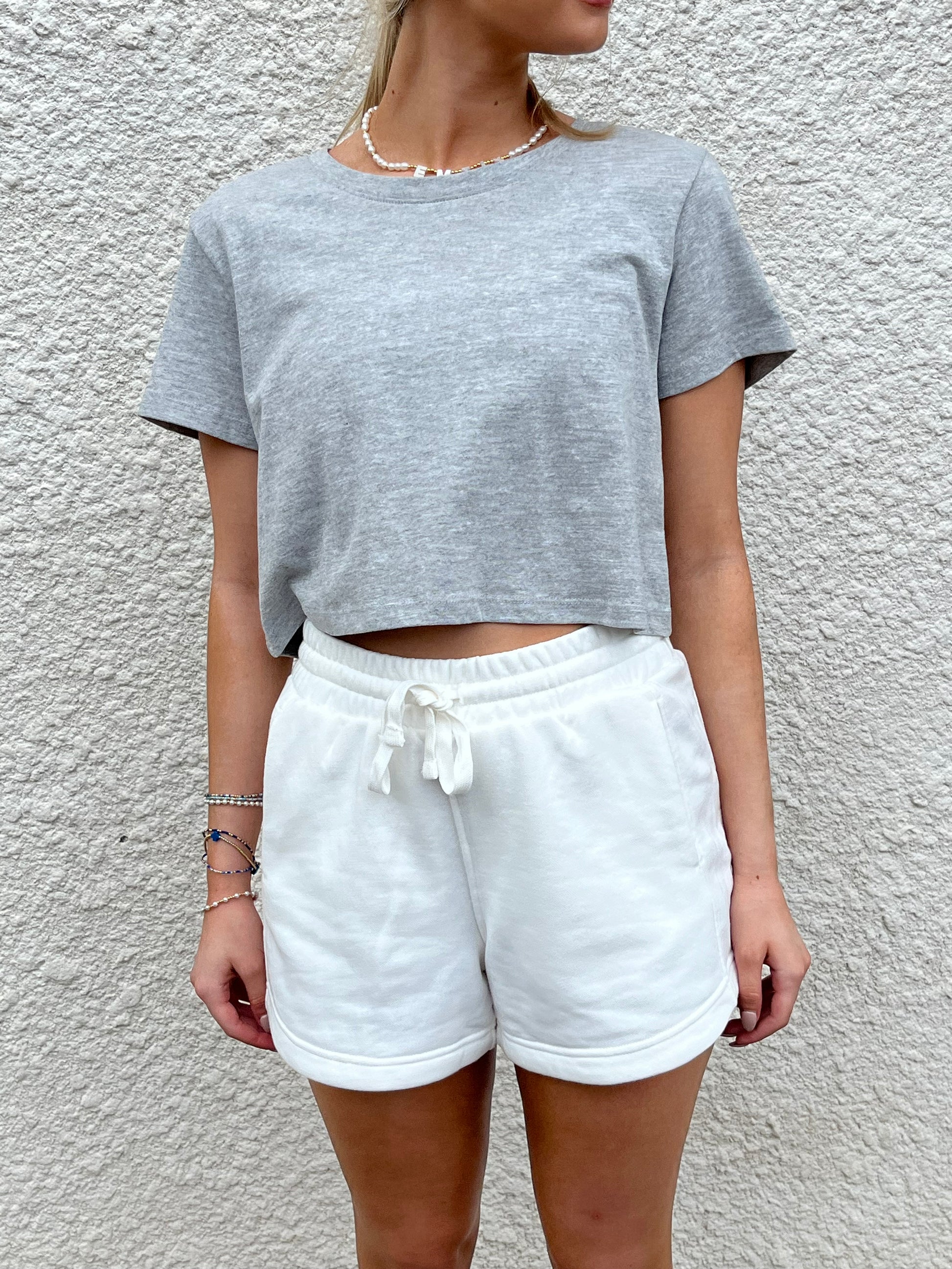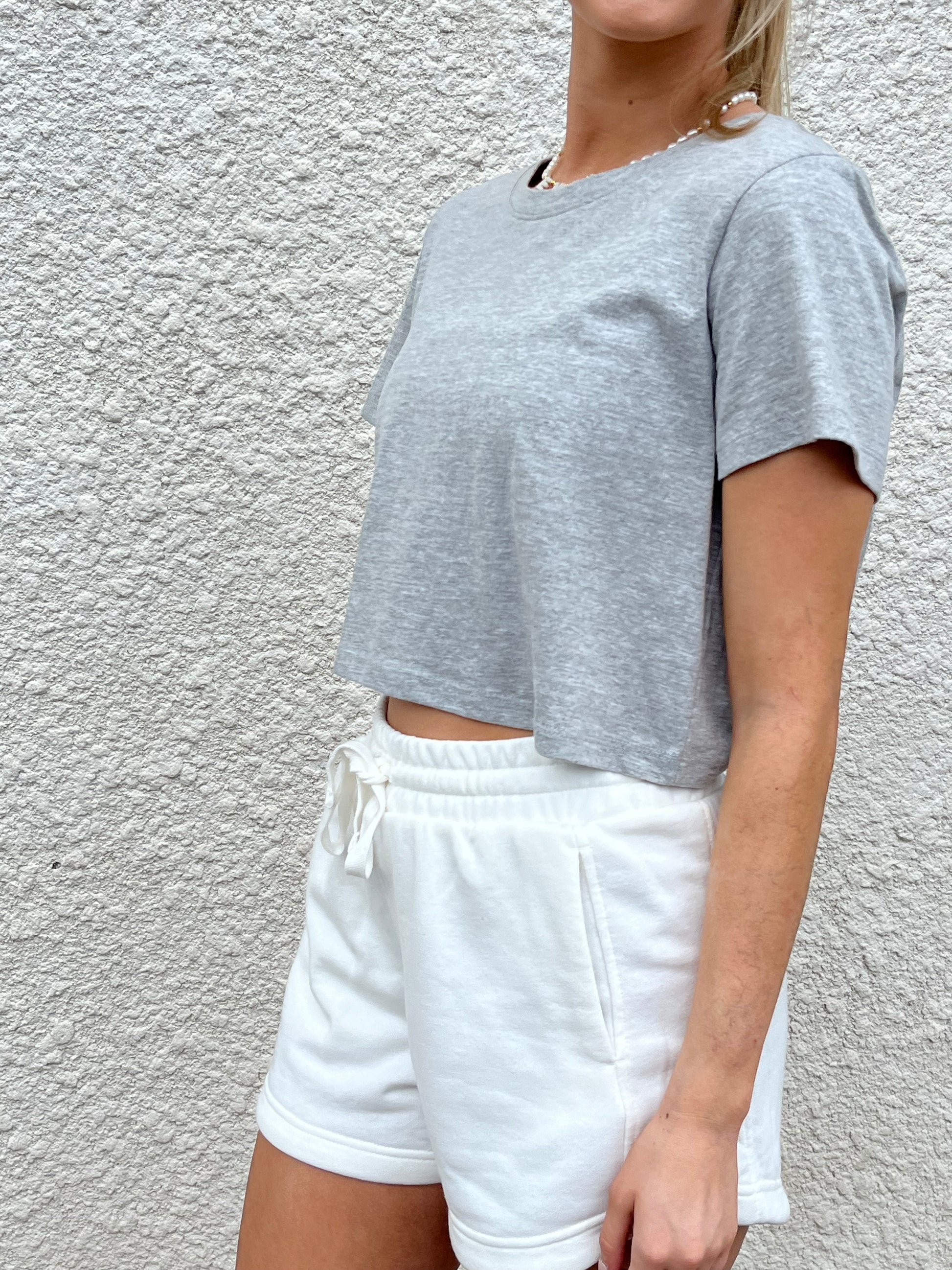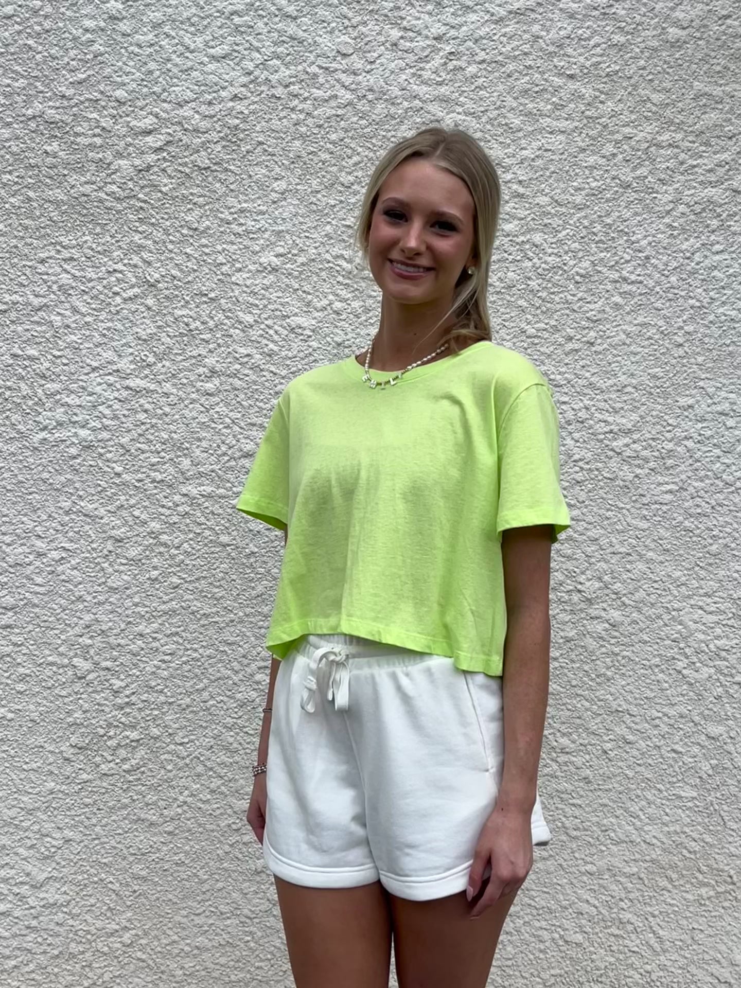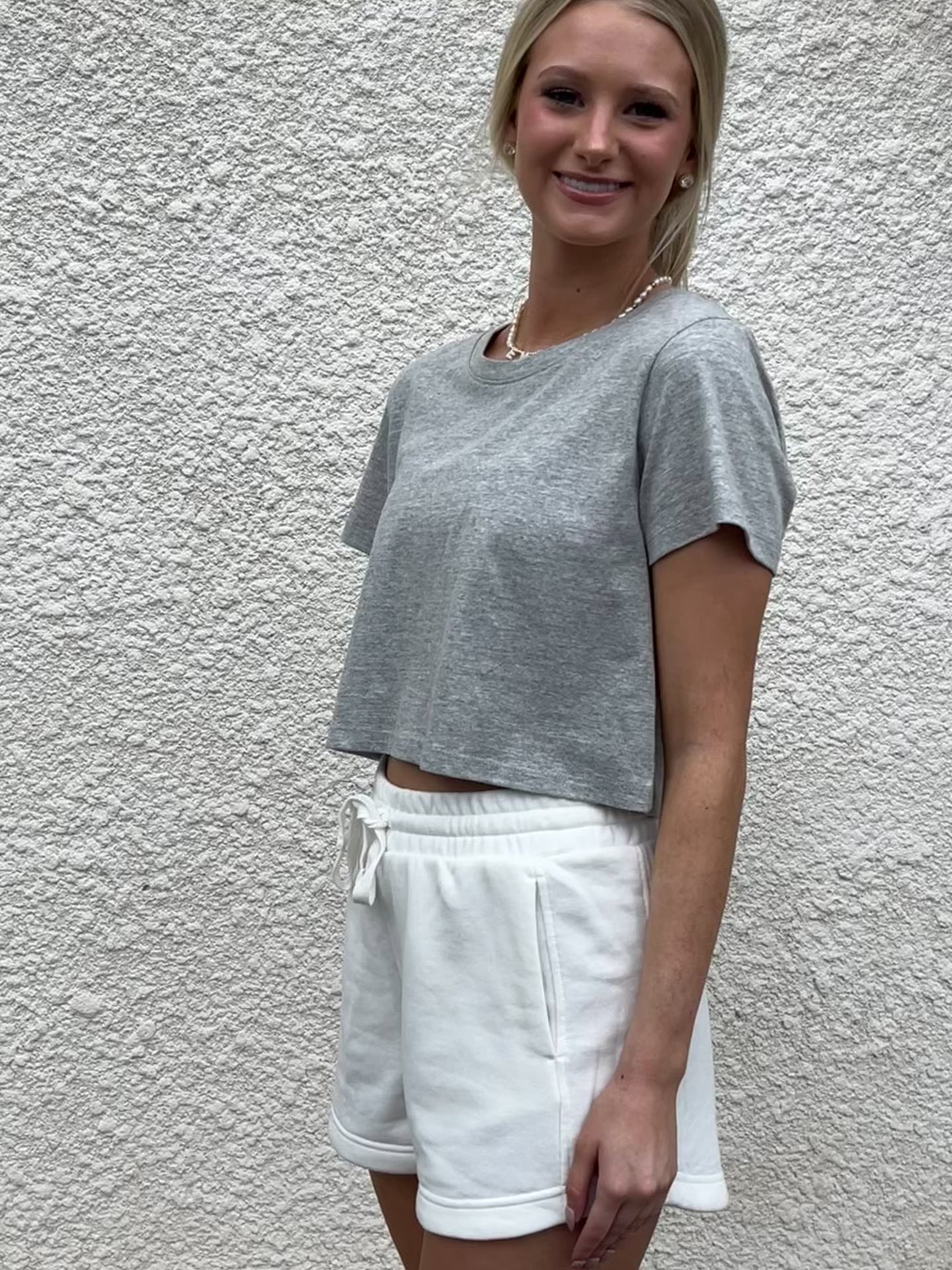 Features: Premium cotton crop top. Boxy, round neck, short sleeve