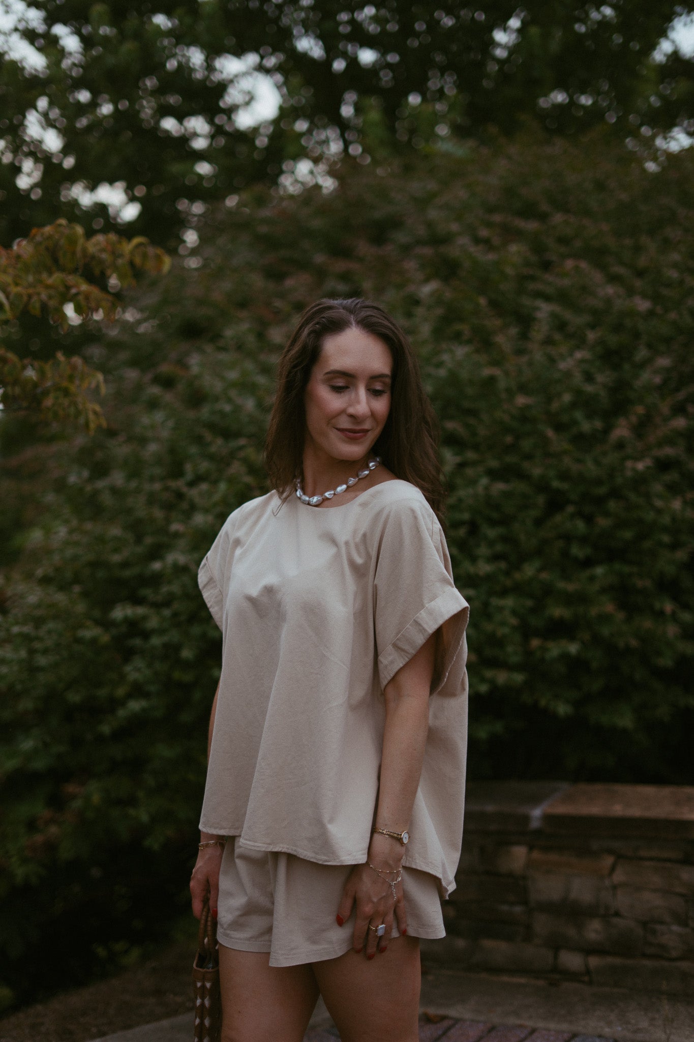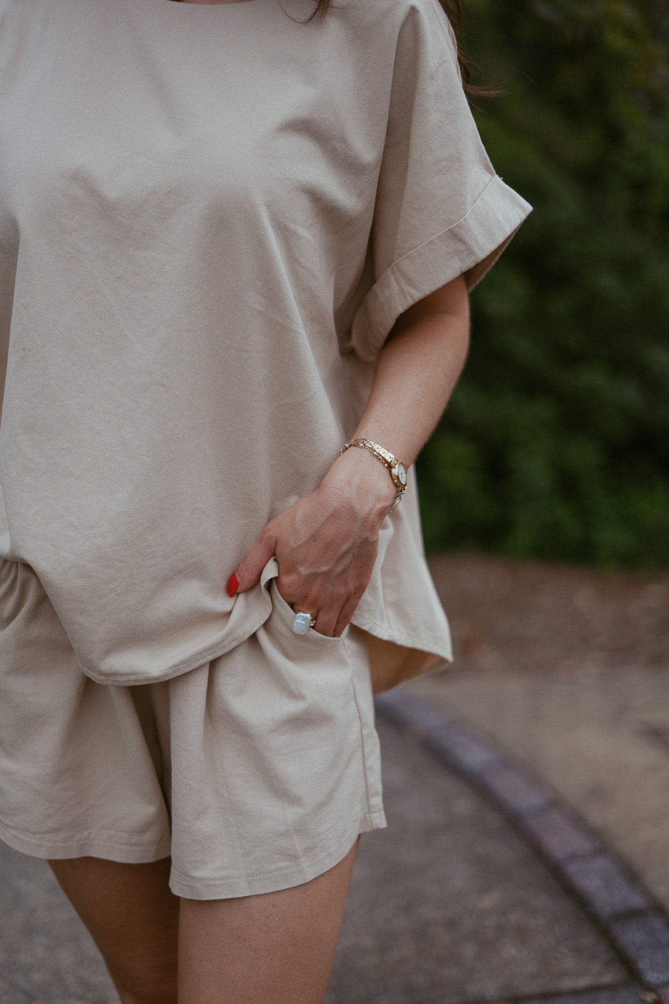 Features: loose collar with drop sleeve, elastic waistband shorts with side pockets